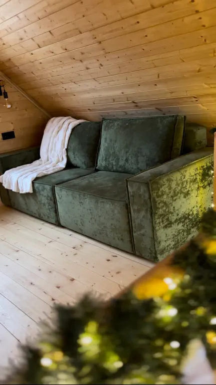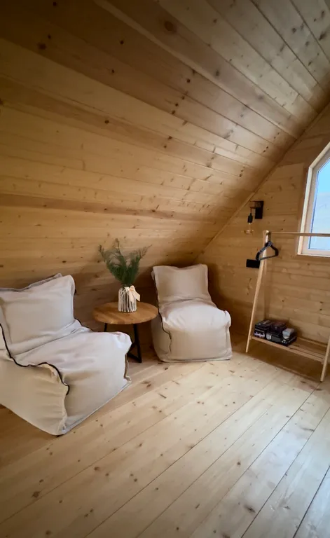 В спальне-гостиной на 2 этаже раскладной диван (160х200) с постельным бельём, 2 удобных пуфа и журнальный столик, напольная вешалка с полкой для одежды, настольные игры.