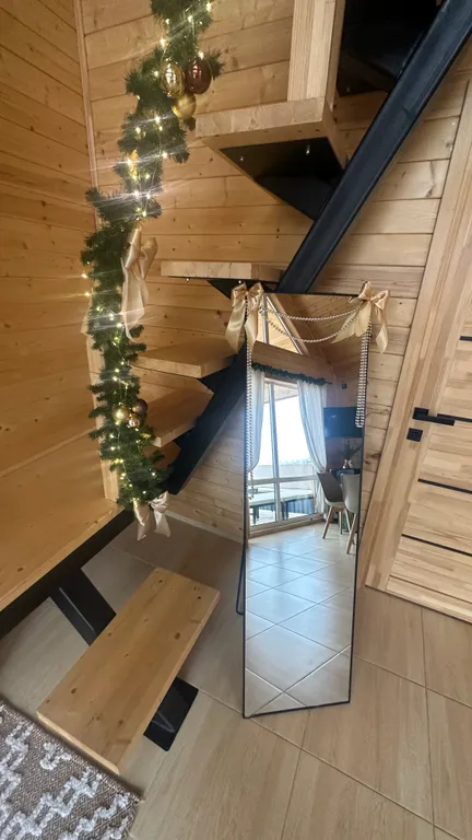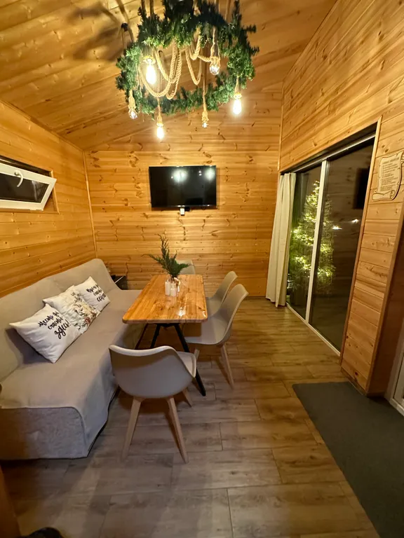 В гостиной на 1 этаже — кухонная зона, обеденный стол с удобными стульями, раскладной диван (160х200) с постельным бельём, телевизор, холодильник, вешалка для одежды и этажеркой для обуви, большое зеркало в полный рост, музыкальная bluetooth колонка с караоке и 2 микрофонами.