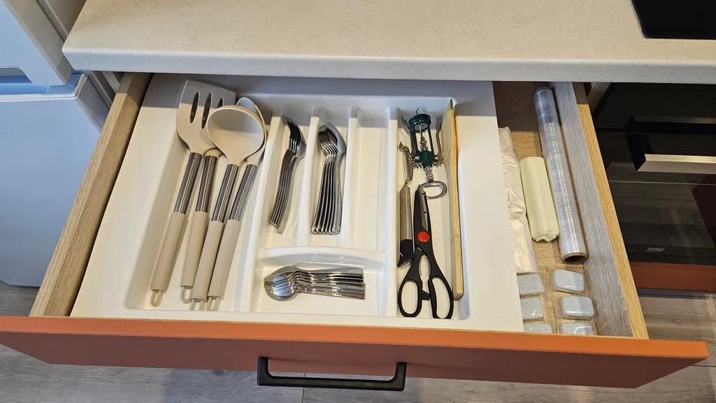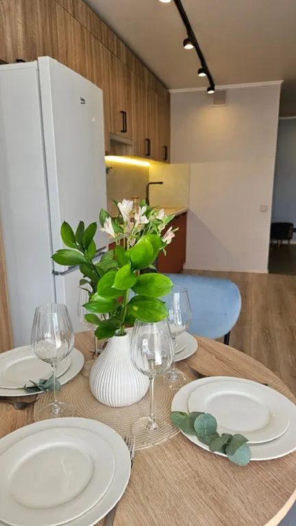 - эстетичная кухня с новой посудой и встроенным фильтром для воды