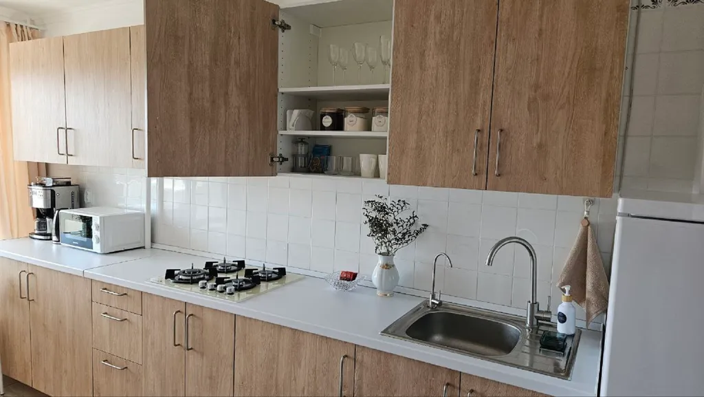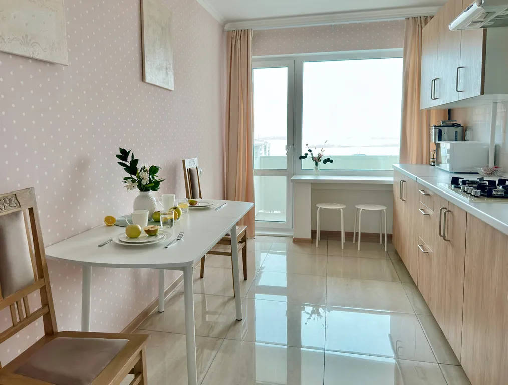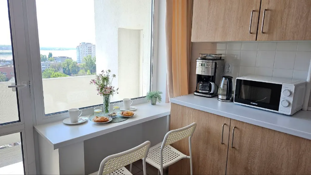 Светлая кухня с большим окном и видом на небо и Волгу