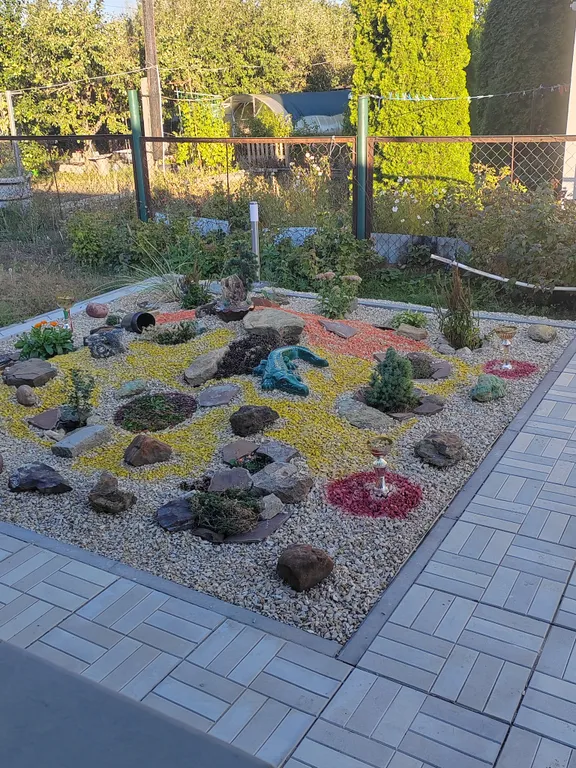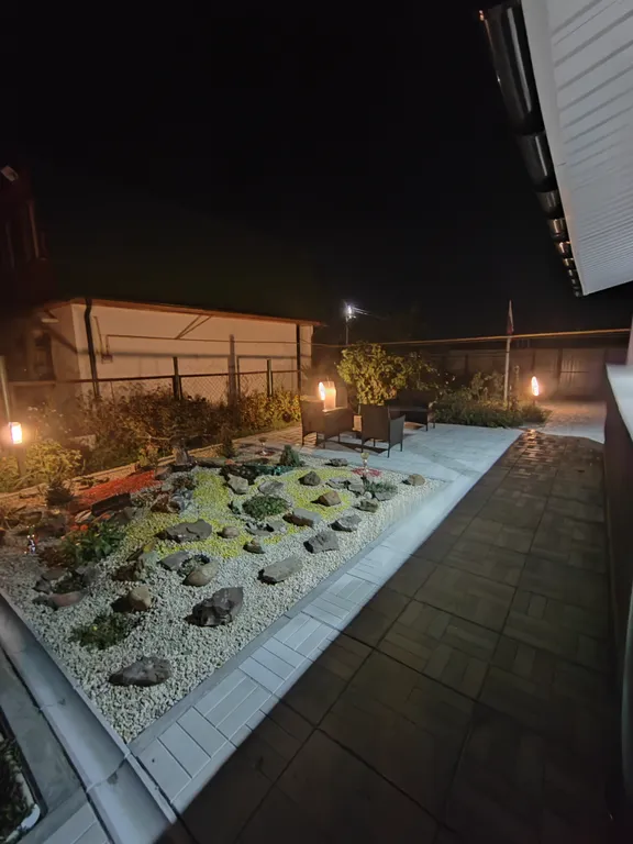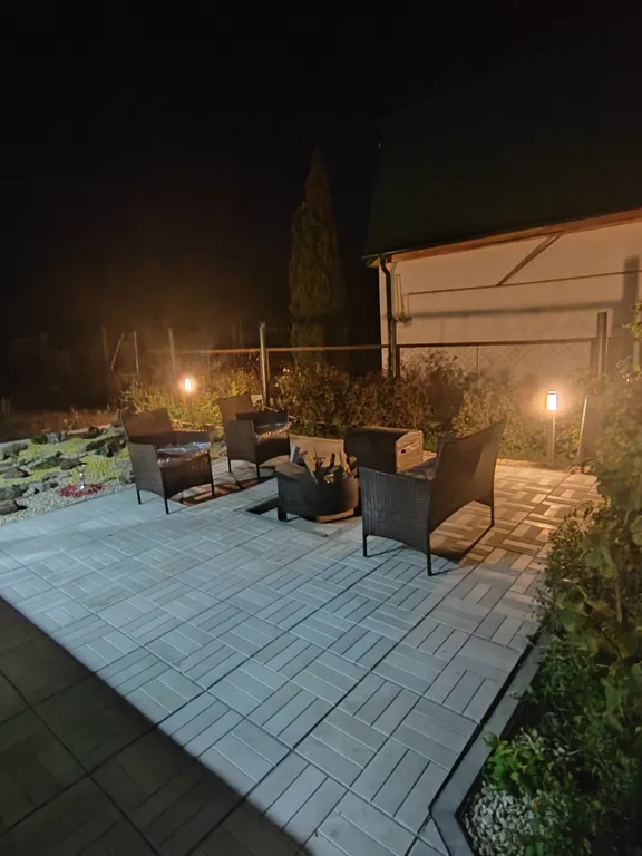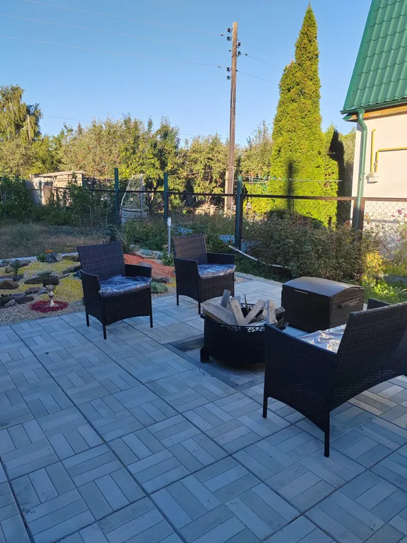 На территории участка имеется гриль-мангал и зона отдыха с костровой чашей и удобными креслами, на террасе комфортная мебель из искусственного ротанга.
